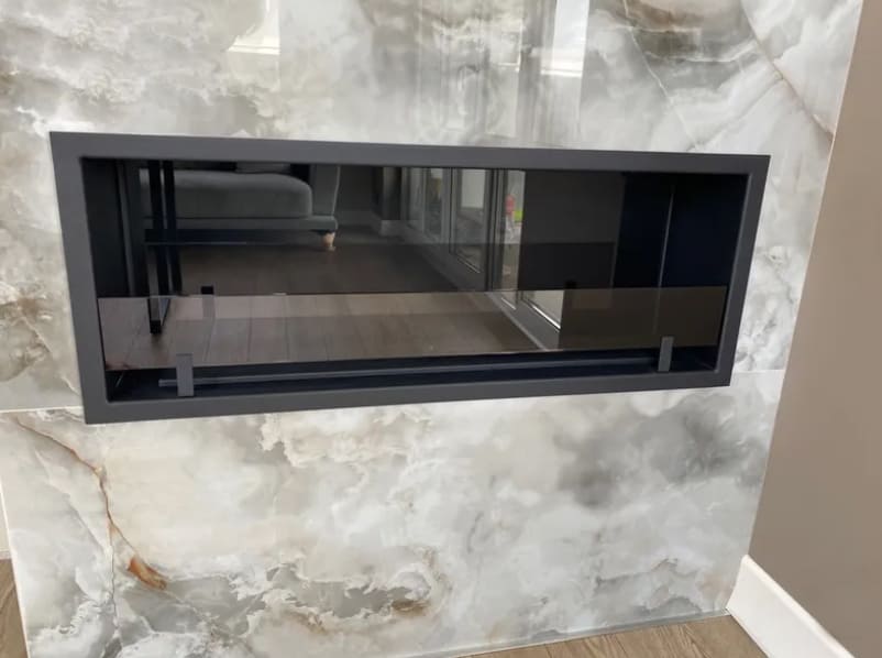 Декоративное стекло — крепится на всю заднюю стенку очага. За счет своего зеркального отражения, пламя визуально становится в 2 раза больше и кажется, что камин горит еще ярче.