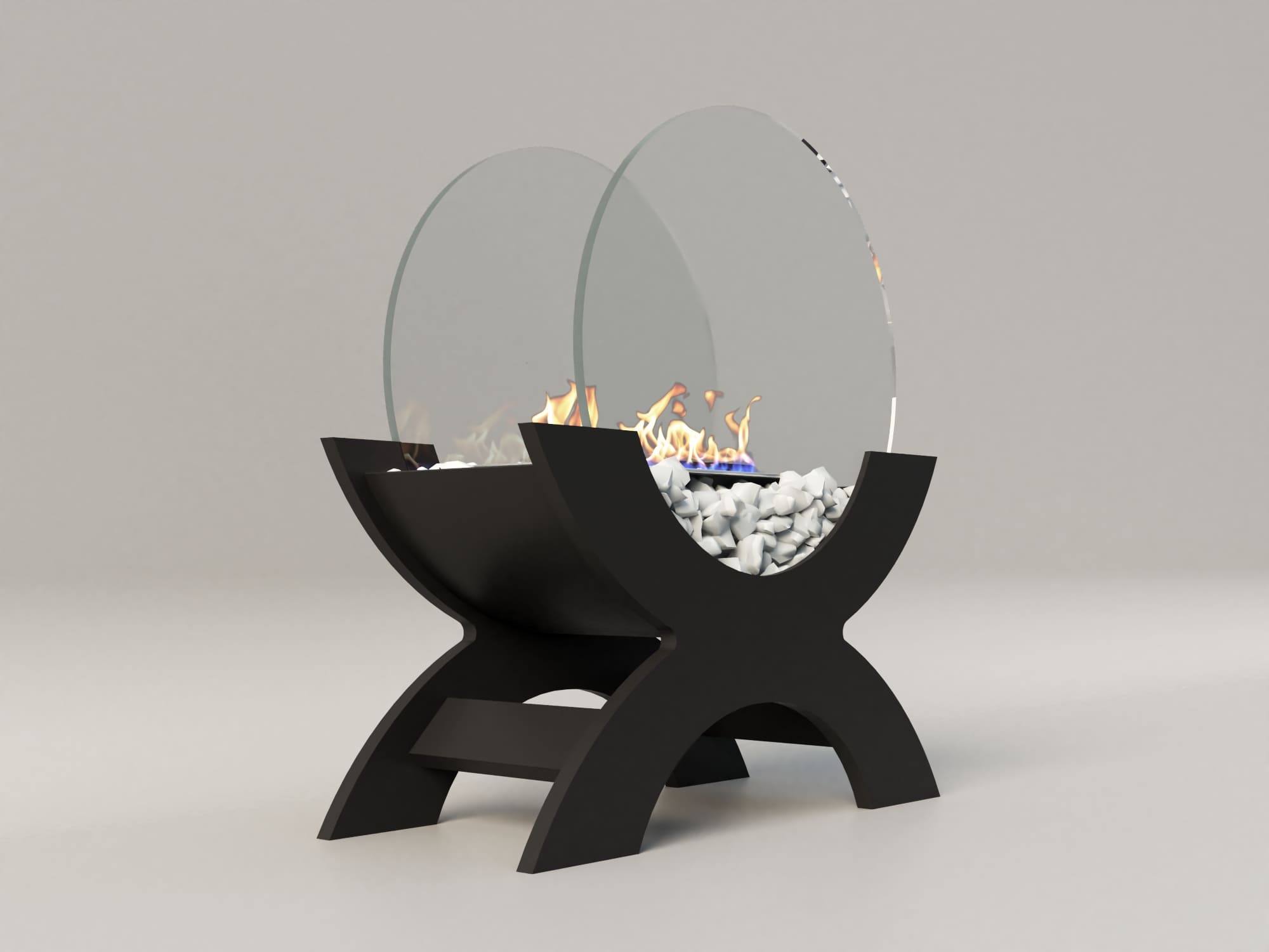 Переносной камин устанавливается на полу и не требует дымохода. Линия огня данного камина 300 мм, располагается практически по всей длине камеры сгорания. Основание биокамина — 100% сталь, ножки изготовлены из МДФ, топливный блок выполнен из высококачественной нержавеющей стали, наполнитель — керамическое волокно, а также закаленные жаропрочные стекла толщиной 6 мм, камни — галтованный мрамор.