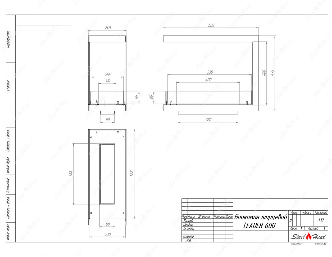 Встраиваемый Биокамин торцевой SteelHeat Leader 600предназначен для встраивания в глухие ниши из гипсокартона, кирпича, пеноблоков, бетона.