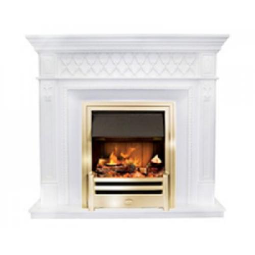 Очаг «Cavendish», благодаря классическому стилю, в котором он выполнен, отлично вписывается в портал. Золотая рамка создает контраст с белым цветом портала, который очень приятен взгляду. Выглядит он достаточно строго, а керамический муляж, выполненный в виде аккуратно сложенных дров, создает впечатление, что в помещении установлен настоящий дровяной камин. Панель управления декорирована под вытяжку, что позволяет максимально скрыть ее от взгляда.