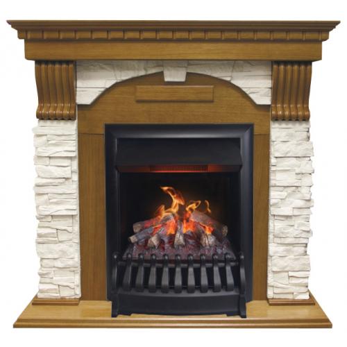Каминокомплект «Dublin», оформленный современным очагом «Oregan 3D», в котором реализован 3D эффект дыма и огня, выполнен в классическом вертикальном стиле, а при его оформлении использована качественная имитация дерева и камня. Основа камина выполнена из качественного МДФ, который изготавливается из древесной фракции без добавления синтетических смол. Именно поэтому он по характеристикам похож на натуральное дерево, практически не уступая ему по плотности и обрабатываемости. А вот вес такого материала значительно ниже, что облегчает процесс монтажа портала на выбранное место. Облицовка камина осуществляется при помощи имитации камня нежного белого цвета. Декоративные же элементы покрыты натуральным шпоном под цвет и фактуру дуба или темного дуба.
