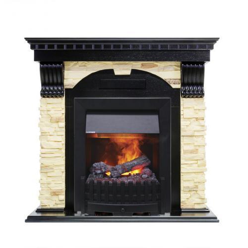 Классический очаг, встроенный в портал, выполнен в черном цвете, который сочетается с расцветкой декора и формирует контраст на фоне камня. Его нижняя часть выступает немного вперед и оформлена в виде колосниковой корзины. В нее встроен механизм парогенерации, закрываемый сверху муляжом дров и углей. При включенном очаге создается максимально реалистичная картина.